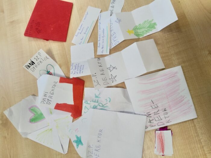 słodkie, życzliwe karteczki: na nich serduszka, pozdrowienia, życzenia, gwiazdeczki. No i ten “derektor” pisany z szacunkiem i uśmiechem.